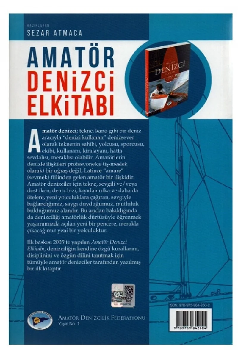 İlk baskısı 2005’te yapılan Amatör Denizci Elkitabı’nın “gözden geçirilmiş yeni baskı”sına yeni çizimler/bilgiler içeren 32 sayfa eklendi ve kapak/sayfa tasarımı yenilendi. Sözlük bölümünde yer alan kelimelerin İngilizce karşılıklarının da eklendiği 302 sayfalık bu baskıda 275 renkli çizim/fotoğraf ve 13 tablo yer alıyor. Sezar Atmaca’nın hazırladığı Amatör Denizci Elkitabı, denizciliğin kendine özgü kurallarını, disiplinini ve özgün dilini tanıtmak için tümüyle amatör denizciler tarafından yazılmış bir ilk kitaptır.