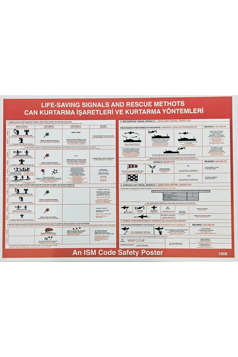 - Uluslararası denizde can kurtarma ve tehlike sinyallerini gösteren bilgilendirme levhası. UV dayanımlı baskı.