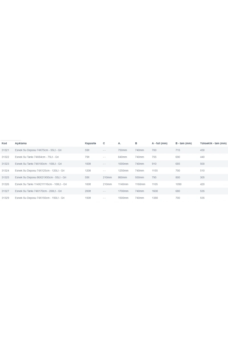 Nuova Rade Esnek Su Depoları, gri renkte 6 dikdörtgen boyutta ve 2 üçgen boyutta mevcuttur.