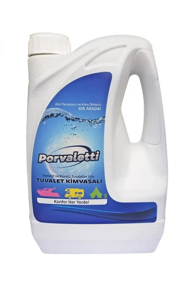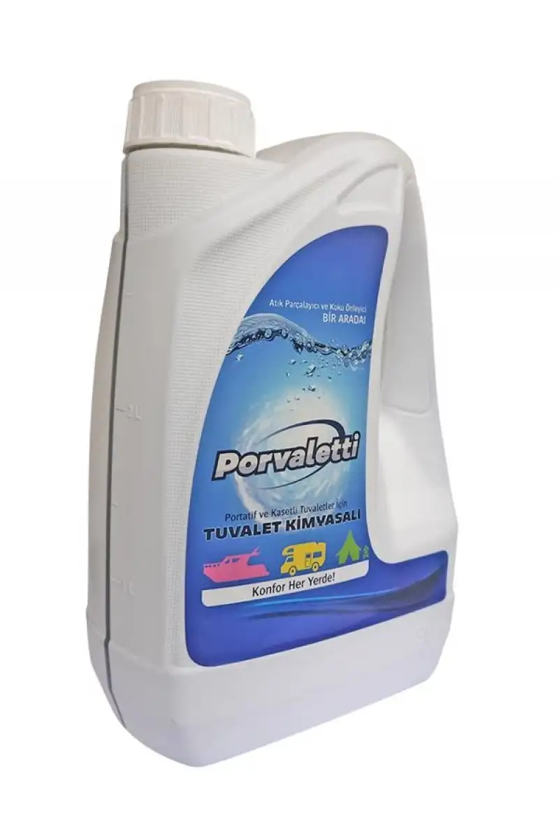 Portatif ve kasetli tuvaletlerde tuvalet kimyasalı olarak kullanılır. Kamp ve karavanda kullanılan portatif ve kasetli tuvaletlerin atık su tankları nasıl temizlenir? Porvaletti Tuvalet Kimyasalı, portatif ve kasetli tuvaletlerin atık su tanklarında; atıkların parçalanmasını ve tankın kolay temizlenmesini sağlayan tuvalet kimyasalıdır. Tanktaki kötü kokuları ortadan kaldırır. Evlerde kullanılan hasta tuvaletlerinin atık su tanklarında da kullanılır.