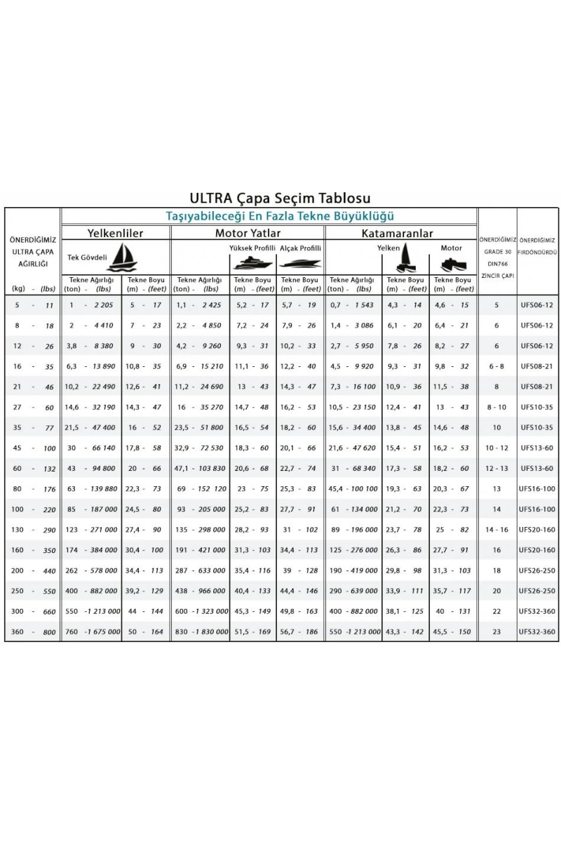 Ultra Çapa bütün tekne tiplerine uygundur ve baş makaralarında sorunsuz çalışır. Standart olarak Ultra Çapalar 8kg-200kg aralığında imal edilir. Daha büyük çapalar ise sipariş ile imal edilebilir.