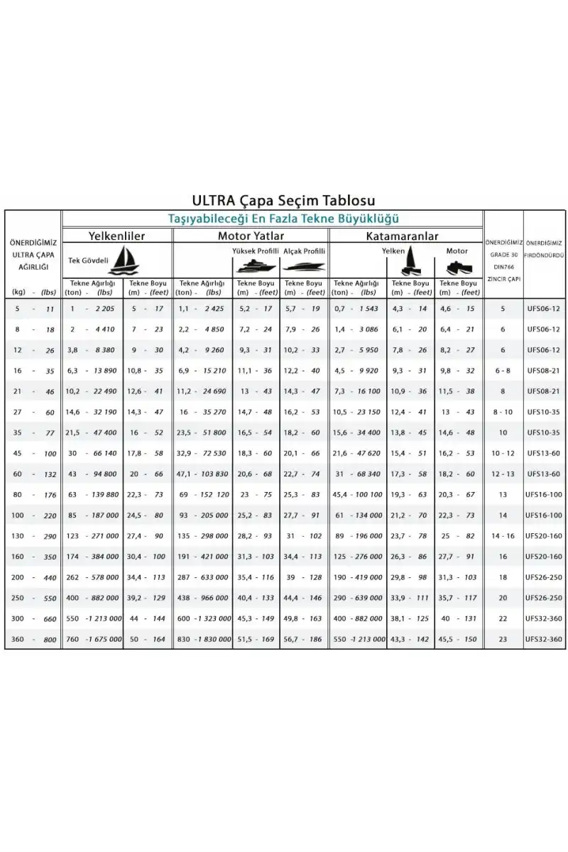 Ultra Çapa bütün tekne tiplerine uygundur ve baş makaralarında sorunsuz çalışır. Standart olarak Ultra Çapalar 8kg-200kg aralığında imal edilir. Daha büyük çapalar ise sipariş ile imal edilebilir.