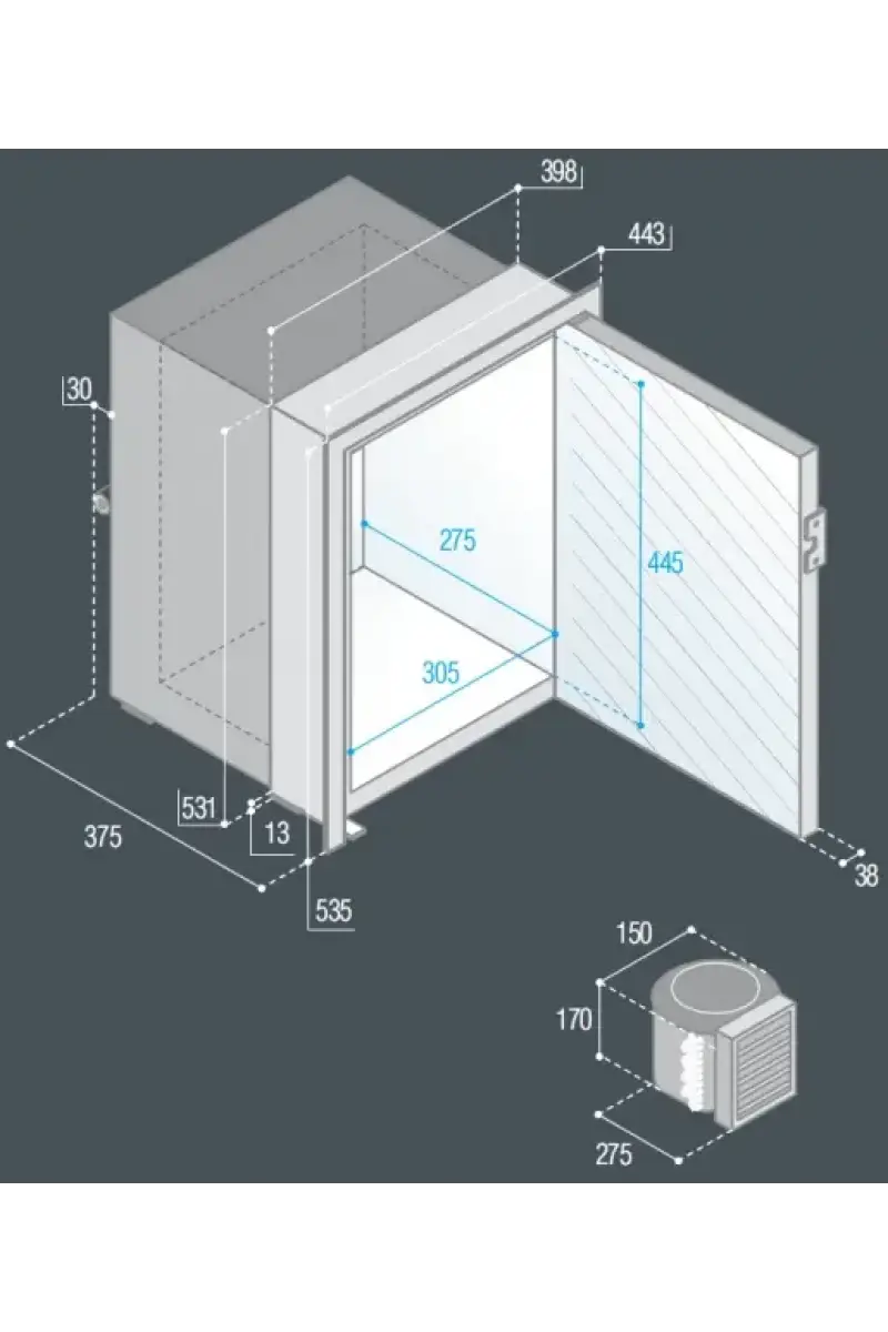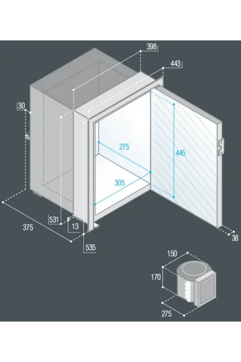Paslanmaz çelik kapaklı. Kompresör ünitesi dolabın 1,5 metre uzağına kadar konabilir.- 40 litre iç hacim