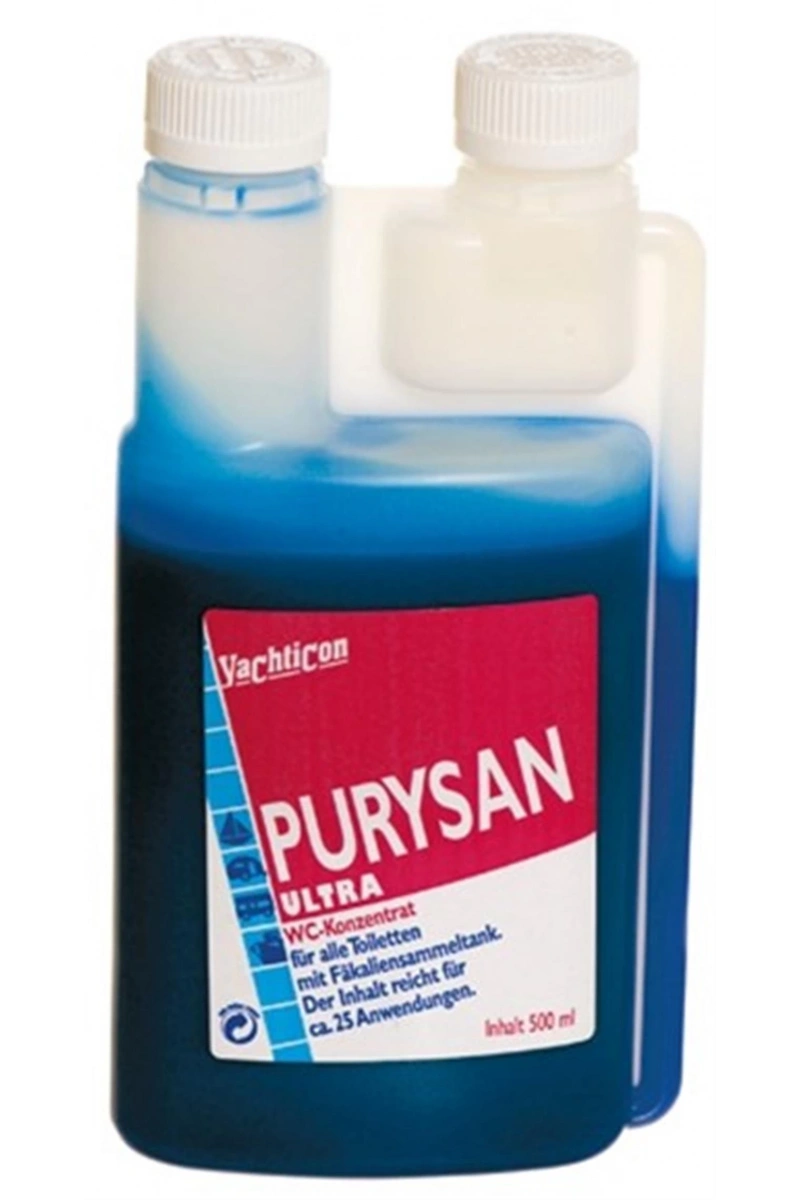 Purysan ultra 500 ml. Tank ve tuvalet kokularını önlemenin en kolay ve sağlıklı yoludur. Tankı dezenfekte eder, katı atık ve tuvalet kağıtlarını çabuk ve etkili bir biçimde öğütür. Temiz ve taze koku verir. Konsantre olması sebebiyle 1 ölçeği 1,5 L suda kullanılır. Formeldehit içermez ve biyolojik olarak çözünebildiği için ve çevreye zarar vermeyen formülü sayesinde dışarıya pompalanması mümkündür. Özel şişesi sayesinde kokusu hep taze kalır.
